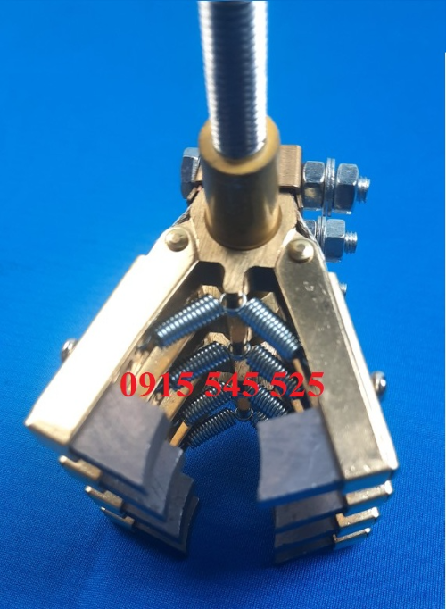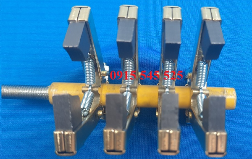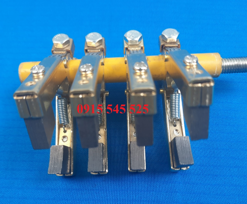 Giá than cho cổ góp điện 4 pha ( 25x65x80) có cấu tạo hình chữ V có khả năng thay đổi góc V bằng lò xo để từ hợp với từng đường kính của cổ góp. Đuôi giá than cổ góp để kẹp ty cố định lổ 12mm và có bulong siết chặt lại. Đầu giá than để bắt than tiếp xúc với cổ góp để lấy điện, than dùng nhiều mòn sẽ thay thế than mới mà không làm ảnh hưởng đến cổ góp.